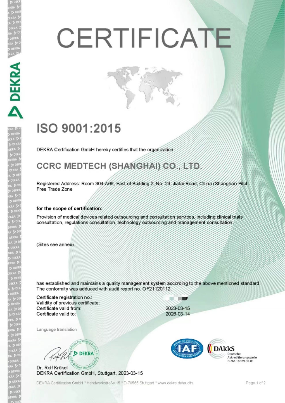 CCRC Medtech (Shanghai) Co., Ltd., founded in 2015, is a clinical research organization (CRO) specializing in the field of medical device technology (i.e., medical devices, in vitro diagnostics, and AI technology). We have provided professional services on clinical studies for a number of well-known domestic and foreign medical device companies, and established a long-term close cooperative relationship with many clinical sites and investigators with rich experience in clinical trial projects in therapeutic fields such as cardiovascular intervention, neurointervention, oncology, respiratory intervention, artificial intelligence, robotics, orthopedics, dentistry, and dermatology.